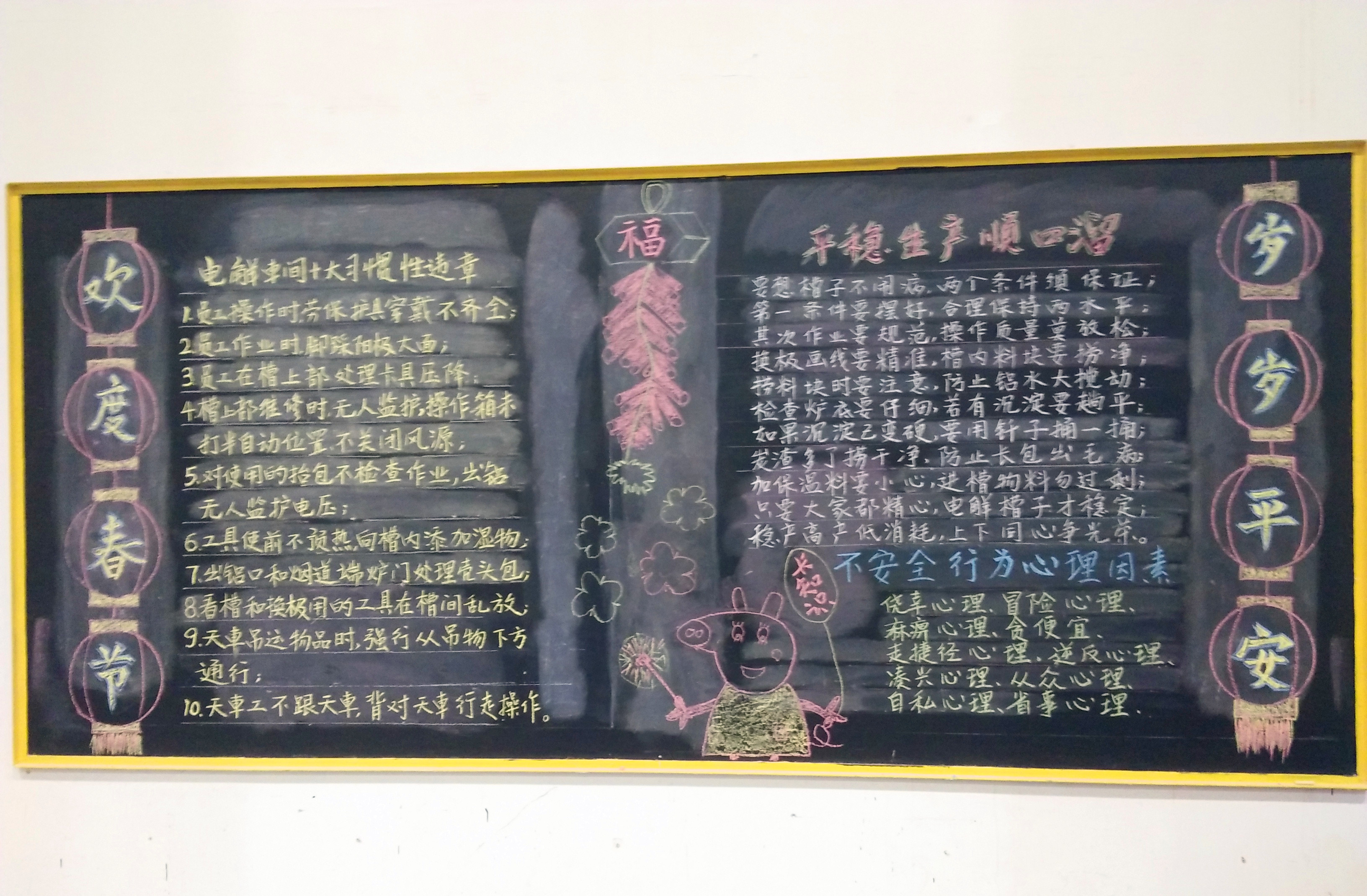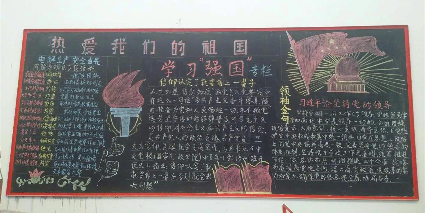在微信時代,提起“黑板報”,人們往往會嗤之以鼻:老掉牙的東西,何足以提?…… 然而,鋁鎂合金500KA系列投運以來,電解一車間舉辦的幾期宣傳黑板報,卻讓人眼前一亮:卡通動漫、吉祥彩燈、飄舞彩旗、熊熊火炬、雄偉的禮堂……,喜慶的節(jié)日氣氛、濃烈的革命傳統(tǒng)……被幾根粉筆鮮活地勾勒出來。