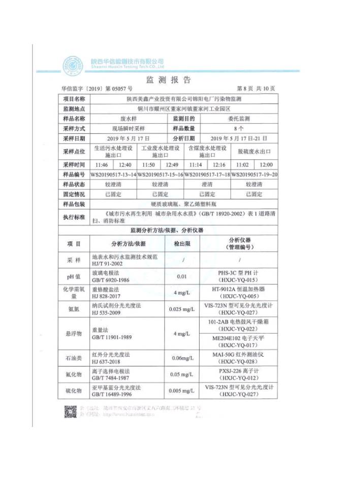 (1)監(jiān)測指標(biāo):pH值、化學(xué)需氧量、氨氮、懸浮物、石油類、氟化物、硫化物、揮發(fā)酚、溶解性總固體(全鹽量)
