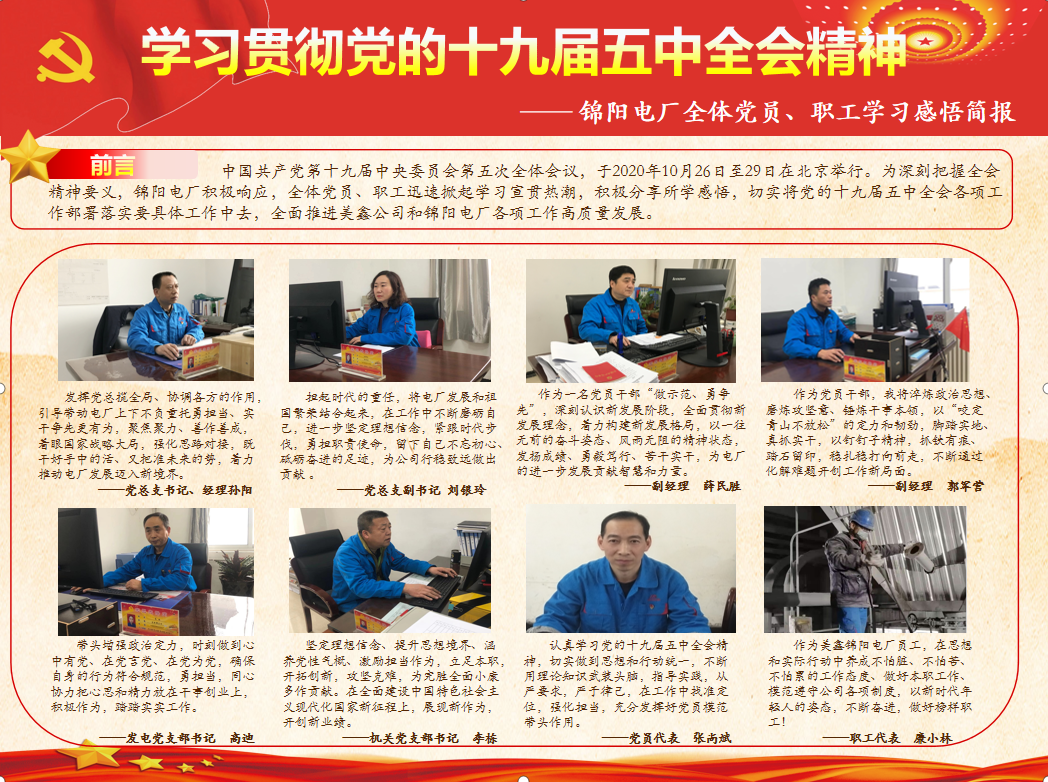 為深入學(xué)習(xí)宣傳貫徹黨的十九屆五中全會精神,指導(dǎo)推動各級黨組織迅速掀起學(xué)習(xí)宣傳貫徹全會精神的熱潮,根據(jù)省國資委黨委、集團(tuán)公司黨委和公司黨委的安排部署,陜西美鑫公司在理論中心組學(xué)習(xí)的基礎(chǔ)上,結(jié)合生產(chǎn)工作實(shí)際,精心安排,領(lǐng)導(dǎo)干部率先垂范,圍繞抓基層黨支部建設(shè)聯(lián)系點(diǎn)活動,自11月25日,成立由公司班子成員組成的學(xué)習(xí)貫徹黨的十九屆五中全會精神宣講團(tuán),有重點(diǎn)的深入基層一線黨支部,結(jié)合《黨的十九屆五中全會精神宣講提綱》內(nèi)容進(jìn)行宣講,在全公司營造了良好的學(xué)習(xí)宣傳貫徹全會精神的濃厚氛圍。 強(qiáng)化政治責(zé)任,不斷增強(qiáng)職工凝聚力     “堅持黨的全面領(lǐng)導(dǎo),堅持以人民為中心,堅持新發(fā)展理念,堅持深化改革開放,堅持系統(tǒng)觀念。”“疫情的沖擊是一時的、總體上是可控的,外部沖擊倒逼我們加快了自主創(chuàng)新步伐,我國經(jīng)濟(jì)長期向好的基本面沒有改變!薄     9名宣講團(tuán)成員分赴各基層單位,重點(diǎn)從深刻認(rèn)識我國進(jìn)入新發(fā)展階段的重大意義、有利條件和重要特征;準(zhǔn)確把握2035年遠(yuǎn)景目標(biāo)和“十四五”時期我國發(fā)展的指導(dǎo)方針、主要目標(biāo)、重點(diǎn)任務(wù);牢牢把握構(gòu)建新發(fā)展格局的戰(zhàn)略構(gòu)想和重要著力點(diǎn);堅持黨的全面領(lǐng)導(dǎo),動員各方面力量為實(shí)現(xiàn)“十四五”規(guī)劃和2035年遠(yuǎn)景目標(biāo)而團(tuán)結(jié)奮斗四個方面出發(fā)進(jìn)行宣講。引導(dǎo)廣大職工自覺把思想認(rèn)識統(tǒng)一到黨中央和習(xí)總書記的決策部署上來,深刻認(rèn)識全會核心要義,用全會精神武裝頭腦。     宣講會上,廣大職工聚精會神聆聽,全神貫注領(lǐng)會。各基層黨組織根據(jù)宣講學(xué)習(xí)內(nèi)容展開熱烈討論,談思想認(rèn)識、講學(xué)習(xí)體會、把工作作風(fēng)、定工作基調(diào)。通過交流,廣大職工對“十四五”規(guī)劃相關(guān)內(nèi)容有了更充分的認(rèn)識、更深刻的理解,切實(shí)將智慧和力量凝聚到落實(shí)全會精神的各項目標(biāo)任務(wù)上來。 全面準(zhǔn)確解讀,把握核心要義和重點(diǎn)內(nèi)容     “要加快科技自立自強(qiáng)。這是確保國內(nèi)大循環(huán)暢通、塑造我國在國際大循環(huán)中新優(yōu)勢的關(guān)鍵。要增強(qiáng)責(zé)任感和危機(jī)感,丟掉幻想,正視現(xiàn)實(shí),打好關(guān)鍵核心技術(shù)攻堅戰(zhàn),加快攻克重要領(lǐng)域“卡脖子”技術(shù)!薄皥猿謱(shí)施更大范圍、更寬領(lǐng)域、更深層次對外開放,依托我國大市場優(yōu)勢,促進(jìn)國際合作,實(shí)現(xiàn)互利共贏”……     宣講輔導(dǎo)中,宣講團(tuán)成員主要圍繞廣大職工普遍關(guān)心的問題、公司發(fā)展密切相關(guān)問題進(jìn)行重點(diǎn)講解,深入淺出、重點(diǎn)突出,不僅從理論層面深度解讀,更是結(jié)合公司發(fā)展實(shí)際,深刻闡明今后一個時期我國發(fā)展的指導(dǎo)方針、目標(biāo)任務(wù)、戰(zhàn)略舉措,并對黨中央關(guān)于當(dāng)前形勢的重大判斷和關(guān)于推動高質(zhì)量發(fā)展、構(gòu)建新發(fā)展格局等重大部署作了深入解讀,幫助廣大職工進(jìn)一步加深對五中全會精神實(shí)質(zhì)、精髓要義、政策措施的認(rèn)識。     “宣講團(tuán)成員的宣講輔導(dǎo)生動深刻,對我們學(xué)習(xí)貫徹全會精神起到有力推動作用。”“宣講報告內(nèi)涵豐富、講解透徹,聯(lián)系實(shí)際、回應(yīng)關(guān)切,很及時、很解渴,能幫助我們?nèi)、深入、系統(tǒng)、準(zhǔn)確地理解把握全會精神。”聽完宣講后,有的參會代表說到。 提高宣講實(shí)效,多措并舉推動全會精神落地生根     “要切實(shí)增強(qiáng)緊迫感,繼續(xù)以時不我待、只爭朝夕的精神,全力以赴投身各項工作。”“要堅持始終把嚴(yán)抓安全生產(chǎn)放在突出重要的位置,要進(jìn)一步強(qiáng)化干部隊伍作風(fēng)建設(shè)工作,營造風(fēng)清氣正的干事創(chuàng)業(yè)發(fā)展環(huán)境!薄     在公司宣講團(tuán)示范下,各基層單位多措并舉提高宣講實(shí)效:錦陽電廠黨總支通過動員部署、理論宣講、創(chuàng)辦感悟簡報等形式,指導(dǎo)職工認(rèn)真學(xué)習(xí)領(lǐng)會貫徹五中全會精神;陽極分公司黨總支成立宣講工作組,深入車間、班組一線,推動學(xué)習(xí)貫徹五中全會精神向一線延伸拓展……一場場形式多樣、具體務(wù)實(shí)的宣講活動,持續(xù)推動全會精神進(jìn)入思想進(jìn)入一線。     各基層單位緊密結(jié)合公司和本單位實(shí)際,切實(shí)把學(xué)習(xí)貫徹全會精神與實(shí)現(xiàn)公司年度各項工作目標(biāo)任務(wù)結(jié)合起來,與提升企業(yè)經(jīng)營管理水平結(jié)合起來,與強(qiáng)化安全管理,打贏“百日安全”攻堅戰(zhàn)結(jié)合起來,在統(tǒng)籌抓好常態(tài)化疫情防控和安全穩(wěn)定工作的基礎(chǔ)上,堅持“目標(biāo)不變、任務(wù)不減、標(biāo)準(zhǔn)不降、干勁不松”,全面完成年度各項工作。     隨著宣講活動深入開展,一股學(xué)習(xí)宣傳貫徹全會精