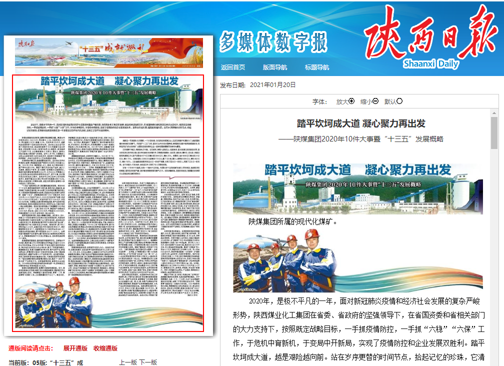 踏平坎坷成大道 凝心聚力再出發(fā) ——陜煤集團2020年10件大事暨“十三五”發(fā)展概略 2020年,是極不平凡的一年,面對新冠肺炎疫情和經(jīng)濟社會發(fā)展的復雜嚴峻形勢,陜西煤業(yè)化工集團在省委、省政府的堅強領導下,在省國資委和省相關部門的大力支持下,按照既定戰(zhàn)略目標,一手抓疫情防控,一手抓“六穩(wěn)”“六!惫ぷ鳎谖C中育新機,于變局中開新局,實現(xiàn)了疫情防控和企業(yè)發(fā)展雙勝利。踏平坎坷成大道,越是艱險越向前。站在歲序更替的時間節(jié)點,拾起記憶的珍珠,它清晰地映照出陜煤在這一年里曾走過怎樣不凡的歷程,又樹立了怎樣不屈的精神。 經(jīng)營業(yè)績再創(chuàng)歷史新高,穩(wěn)增長彰顯陜煤力量。集團全年實現(xiàn)營業(yè)收入3402億元,同比增長12.4%,實現(xiàn)利潤173億元,同比增盈16億元,增幅10.2%。完成投資233億元,超額完成省國資委下達的經(jīng)營目標任務。在全省工業(yè)企業(yè)中發(fā)揮了頂梁柱的作用,被省國資委授予2020年穩(wěn)增長突出貢獻獎,并連續(xù)第六次進入《財富》世界500強榜單,排名繼續(xù)上升至第273位,企業(yè)整體競爭力、創(chuàng)新力、管控力、影響力和抗風險能力得到進一步增強。去年11月下旬,中國煤炭工業(yè)協(xié)會全體領導班子成員親赴西安,現(xiàn)場授予陜煤集團“特別貢獻獎”,并將行業(yè)標桿中心交由陜煤股份承建。 抗疫保供沖鋒在前,急難險重鐵肩擔當。面對突如其來的新冠肺炎疫情,陜煤集團將復產(chǎn)保供作為各項工作的重中之重。2020年3月初,集團煤炭、化工、鋼鐵、電力等板塊復工復產(chǎn)率均達到100%。集團下屬礦井優(yōu)化生產(chǎn)組織,減少人員聚集,提高生產(chǎn)效率,有力保障了疫情重災區(qū)能源供應。集團所屬的蒲城清潔能源化工公司、北元化工公司等煤化工企業(yè)迅速切轉至防疫物資原材料的生產(chǎn),用于口罩、防護服所用無紡布的加工制作。在西安市公共衛(wèi)生中心項目緊張建設中,集團所屬生態(tài)水泥公司快速行動捐贈水泥2754噸。國有企業(yè)鐵肩擔義的精神品格,在抗擊新冠肺炎疫情的斗爭中綻放出了新的光華。 “十四五”規(guī)劃新鮮出爐,高質量發(fā)展繪就藍圖。規(guī)劃中的下一個五年,集團將繼續(xù)堅持“以煤為基,能材并進,技融雙驅,蛻變轉型”的轉型發(fā)展戰(zhàn)略,爭當全國工業(yè)經(jīng)濟高質量發(fā)展的排頭兵,為更好服務國家能源安全戰(zhàn)略、促進經(jīng)濟社會發(fā)展作出新貢獻!展望“十四五”,陜煤集團要實現(xiàn)“16555”戰(zhàn)略目標,即到2025年,以10萬左右產(chǎn)業(yè)工人,6000億元左右資產(chǎn)總額,完成不少于5000億元營業(yè)收入,流通市值不低于5000億元,實現(xiàn)500億元利潤。創(chuàng)新型企業(yè)建設取得明顯成效,新產(chǎn)業(yè)培育實現(xiàn)實質性突破,建成區(qū)域國有資本投資公司標桿企業(yè),為建設世界一流企業(yè)奠定基礎。規(guī)劃還首次研究提出了陜煤集團2035年遠景目標——“五個一”工程,即到2035年,集團資產(chǎn)總額超過10000億元,營業(yè)收入超過10000億元,市值超過10000億元,利潤總額超過1000億元,躋身世界一流企業(yè)行列。 脫貧攻堅成果豐碩,決勝小康履約踐諾。肩負陜北、關中、陜南20個村和安康市漢陰縣牽頭單位的幫扶職責,并承擔陜西省國資委助力脫貧攻堅第六合力團攻堅任務,在決勝全面小康的收官之年,集團繼續(xù)多措并舉打出脫貧攻堅“組合拳”,高質量完成了助力脫貧攻堅工作任務。截至目前,累計投入幫扶資金8.31億元,在榆林地區(qū)開發(fā)實施扶貧項目6個,推動精準幫扶項目317個,包聯(lián)幫扶的20個貧困村全部出列、9個貧困縣全部脫貧摘帽,累計幫扶脫貧3802戶12099人。在第四屆中國能源產(chǎn)業(yè)發(fā)展年會暨“脫貧攻堅·能源扶貧成果報告會”上,陜煤集團被授予十大突出貢獻企業(yè)、扶貧特色案例等12個獎項。 金融藍海弄潮逐浪,股權投資浮盈超兩百億。發(fā)揮資本平臺優(yōu)勢,集團所屬上市公司陜西煤業(yè)近年來拿出不超過30億元的公司自有資金,對外合作開展了不涉及關聯(lián)交易的投資業(yè)務,擇優(yōu)選定業(yè)內(nèi)有實力的合作伙伴,建立了投資顧問模式。圍繞煤炭主業(yè),構建了涵蓋新技術新方法、新產(chǎn)品新產(chǎn)業(yè)、新商業(yè)新生態(tài)、新需求新價值四個方面的投資地圖,明確了煤炭清潔利用技術、煤基產(chǎn)品等20個產(chǎn)業(yè)投資方向。在互聯(lián)網(wǎng)領域,按照上游網(wǎng)絡層信息傳輸基礎設施、中游感知層和網(wǎng)絡層硬件、下游應用需求端和運營商需求端的分類,確定了一系列“萬物互聯(lián)”產(chǎn)業(yè)投資方向。在新能源等領域,聚焦龍頭企業(yè)股權。2020年作為陜西煤業(yè)取得投資回報的第一年,陜西煤業(yè)已實現(xiàn)投資收益+投資浮盈超200億元。 智能化探索勇闖新路,智慧礦井建設領跑全國。近日,國家首批智能化示范建設煤礦名單由國家能源局、國家煤礦安全監(jiān)察局聯(lián)合發(fā)布。陜煤集團下屬的檸條塔、黃陵一二號、曹家灘等7處煤礦入選,占全國數(shù)量的近十分之一。截至目前,陜煤集團已經(jīng)累計建成36個智能采煤工作面,支持70%以上采面達到智能開采,并逐步實現(xiàn)繁重危險崗位由機器