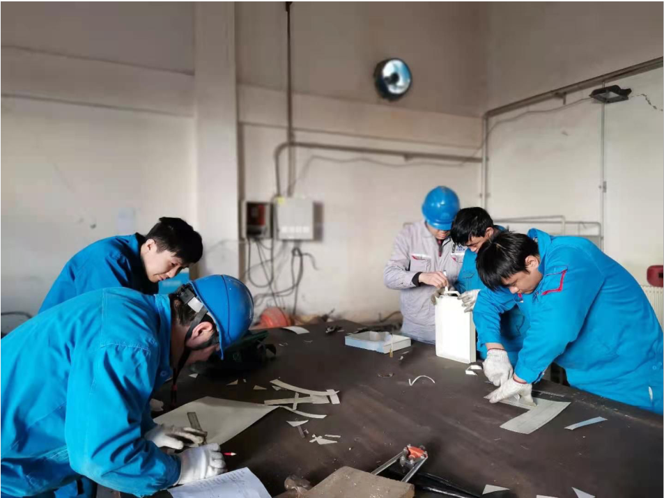 春節(jié)剛過,電廠檢修部機務(wù)操作間里一片忙碌景象。大家手持鋼板尺、錘頭和鐵皮剪等工具,正爭先恐后的進(jìn)行著一場激烈的技能比賽——制作鐵皮油盤。