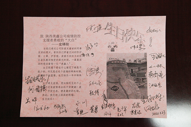 “小史,生日快樂!”3月23日,公司工會主席、黨委組織部部長包廣平一邊送上生日祝福,一邊將含有公司黨政領(lǐng)導(dǎo)和機(jī)關(guān)值守職工簽名的特殊生日賀卡遞給史鐸陽。此時,公司綜合辦公室主任、工會女工委主任馬海聆也將早已準(zhǔn)備好的生日面送了上來。 史鐸陽接過特殊的生日賀卡和熱騰騰的生日面,連說“沒想到”,并表示,作為在疫情防控工作中的幫扶隊員,度過了一個特別的、難以忘懷的生日,更加激勵自己干好疫情防控工作。 自本輪疫情發(fā)生以來,公司積極響應(yīng)銅川市新冠肺炎疫情防控指揮部號召,連夜組建了一支30人的疫情防控一對一幫扶隊,定點幫扶我市疫情高風(fēng)險區(qū)域。史鐸陽就是這支“逆行者”隊伍中的一員。全體幫扶隊員不分晝夜、嚴(yán)守崗位、不辭辛苦,展現(xiàn)了美鑫人的責(zé)任與擔(dān)當(dāng)。 一份小小的生日禮物,體現(xiàn)了公司工會對職工的關(guān)愛之情,讓公司防疫幫扶隊隊員史鐸陽在這個特殊的日子里感受到不一樣的溫暖,更加有信心和動力堅守在疫情防控的一線。 |