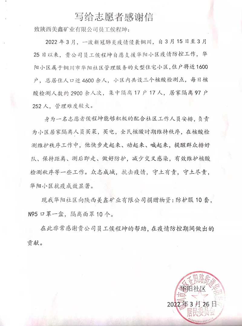 隨著疫情形勢的逐漸好轉(zhuǎn),銅川市也積極有序推進(jìn)復(fù)工復(fù)產(chǎn)。在此次疫情防控工作中我們要向參與防疫的醫(yī)務(wù)人員、志愿者表示由衷的感謝,是他們用實際行動為大家筑起了一道道健康的“防火墻”,守護(hù)著我們的安全。當(dāng)問道侯程坤在此次“抗擊疫情”中有什么感悟時,他答到:“雖然志愿服務(wù)結(jié)束了,但這次的經(jīng)歷對我來講卻是一次非常難得的錘煉,雖然付出了很多的汗水,但是當(dāng)我看到華陽小區(qū)生活秩序得到穩(wěn)定恢復(fù),自己也受到了華陽社區(qū)的表揚和認(rèn)可時,我覺得一切付出都是值得的。如若有一天,國家、社會和我們企業(yè)再一次需要我,我仍將義無反顧的投身第一線,用實際行動來證明國有企業(yè)職工的責(zé)任和擔(dān)當(dāng)!