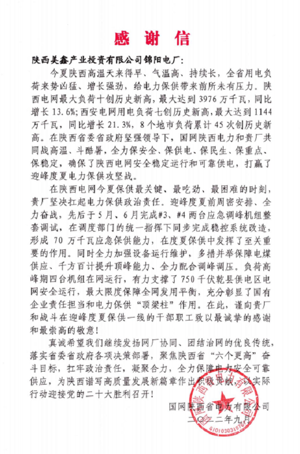 2022年9月,國網陜西省電力有限公司向錦陽電廠發(fā)來感謝信,對錦陽電廠在迎峰度夏期間奮戰(zhàn)一線戰(zhàn)高溫、斗酷暑、保供電的干部職工予以感謝。 為認真貫徹落實上級有關疫情防控、安全生產、電力保供的決策部署,錦陽電廠不懼抗疫保電雙重壓力,科學應對、精準施策,提前制定迎峰度夏、可靠供電及電網安全工作方案,建立用電保障24小時生產現場領導帶班工作機制,持續(xù)強化運行管理,加強設備巡檢力度及頻次,全面提高設備健康水平,為迎峰度夏安全生產打牢堅實基礎。在國網陜西省電力有限公司及美鑫公司的大力支持和關懷下,電廠全體職工及外委單位同心同向、沖鋒在前、攻堅克難、堅守陣地,在做好鋁鎂合金可靠供電的前提下,全面打贏保安全、保供電、戰(zhàn)疫情攻堅戰(zhàn)! 接下來,錦陽電廠將一如既往扛起責任,以昂揚的斗志、堅定的信念,全力保障電力安全可靠供應,以優(yōu)異的成績迎接黨的二十大勝利召開。 |