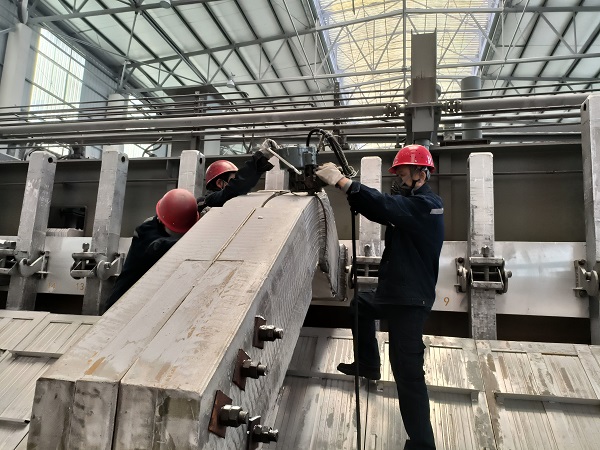 電解槽進(jìn)電端軟連接是立柱母線與平衡母線重要的連接部件,起到導(dǎo)電作用,使立柱母線在上下移動(dòng)過(guò)程中不會(huì)破壞母線結(jié)構(gòu)。 但在電解作業(yè)過(guò)程中,天車打殼機(jī)頭易碰撞到軟連接,致使其產(chǎn)生破損,從而導(dǎo)致壓降增大、電耗增高,直接影響到生產(chǎn)實(shí)際。針對(duì)此種情況,車間安排綜合班人員在不影響正常生產(chǎn)的情況下,對(duì)電解槽進(jìn)電端軟連接鋼帶損壞、脫落部分進(jìn)行捆扎修復(fù)。經(jīng)過(guò)5天的努力,600余條電解槽進(jìn)電端軟連接全部修復(fù)完畢,消除了軟連接破損造成的安全隱患和能源消耗。 此次修復(fù)工作,是電解二車間響應(yīng)公司“降本增效”號(hào)召的又一有力舉措。今后,車間將持續(xù)引導(dǎo)動(dòng)員職工積極參與生產(chǎn)設(shè)備設(shè)施的改造、修復(fù),降低生產(chǎn)成本,減少能源損耗,以實(shí)際行動(dòng)助力綠色低碳發(fā)展。 |