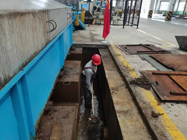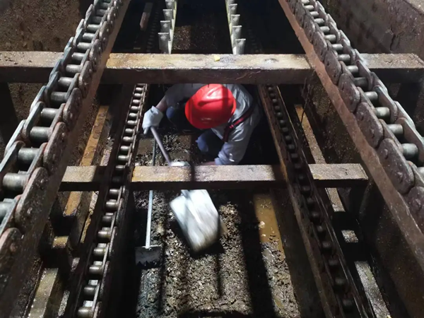 此次清淤工作的主要挑戰(zhàn)是冷運(yùn)機(jī)冷卻噴淋系統(tǒng)水溝屬于半封閉狀態(tài),由于淤泥長時間未清理,水溝底部淤泥積累的有害氣體對作業(yè)人員的生命安全造成隱患。為確保清淤人員的安全,在開始作業(yè)前,車間負(fù)責(zé)人對作業(yè)人員進(jìn)行了有限空間作業(yè)再培訓(xùn),要求作業(yè)人員務(wù)必做好各種安全防護(hù),先通風(fēng)、再檢測、后作業(yè)。同時對監(jiān)護(hù)人進(jìn)行了專項(xiàng)培訓(xùn),確保此項(xiàng)工作安全有序進(jìn)行。清淤過程中,黨員率先垂范,身著連體雨衣,克服環(huán)鏈與地溝之間狹小有限空間難題,手握鐵鍬,或蹲或趴在地溝下作業(yè),一鍬一鍬的把污泥鏟出來裝滿鐵桶運(yùn)至地面,往復(fù)進(jìn)行。經(jīng)過大家共同努力,淤泥被清理干凈,水溝煥然一新。